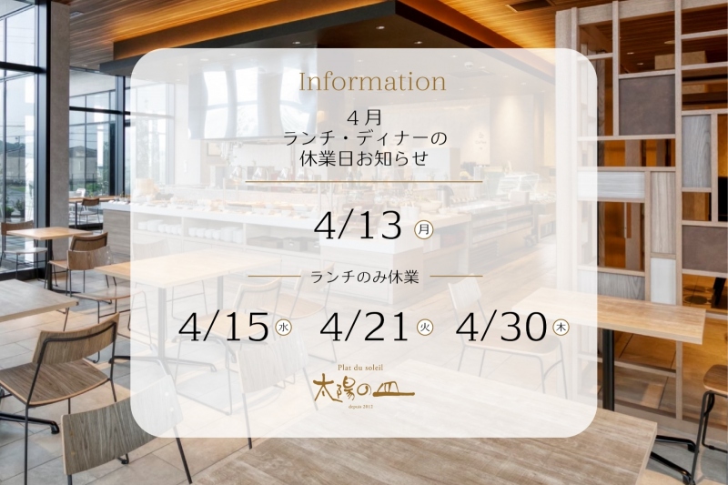 平素より太陽の皿をご利用いただき、誠にありがとうございます。 4月のランチ・ディナー休業日を、下記の通りお知らせいたします。 【4月の休業日】 ・4月13日(月) ・4月15日(水)※ランチのみ休業 ・...